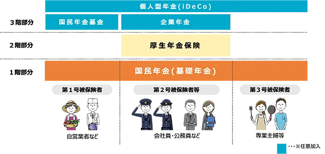 - 1階部分:国民年金(基礎年金)のことで、20歳以上60歳未満の日本国民が加入している。